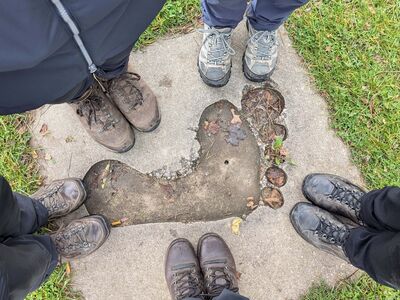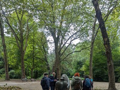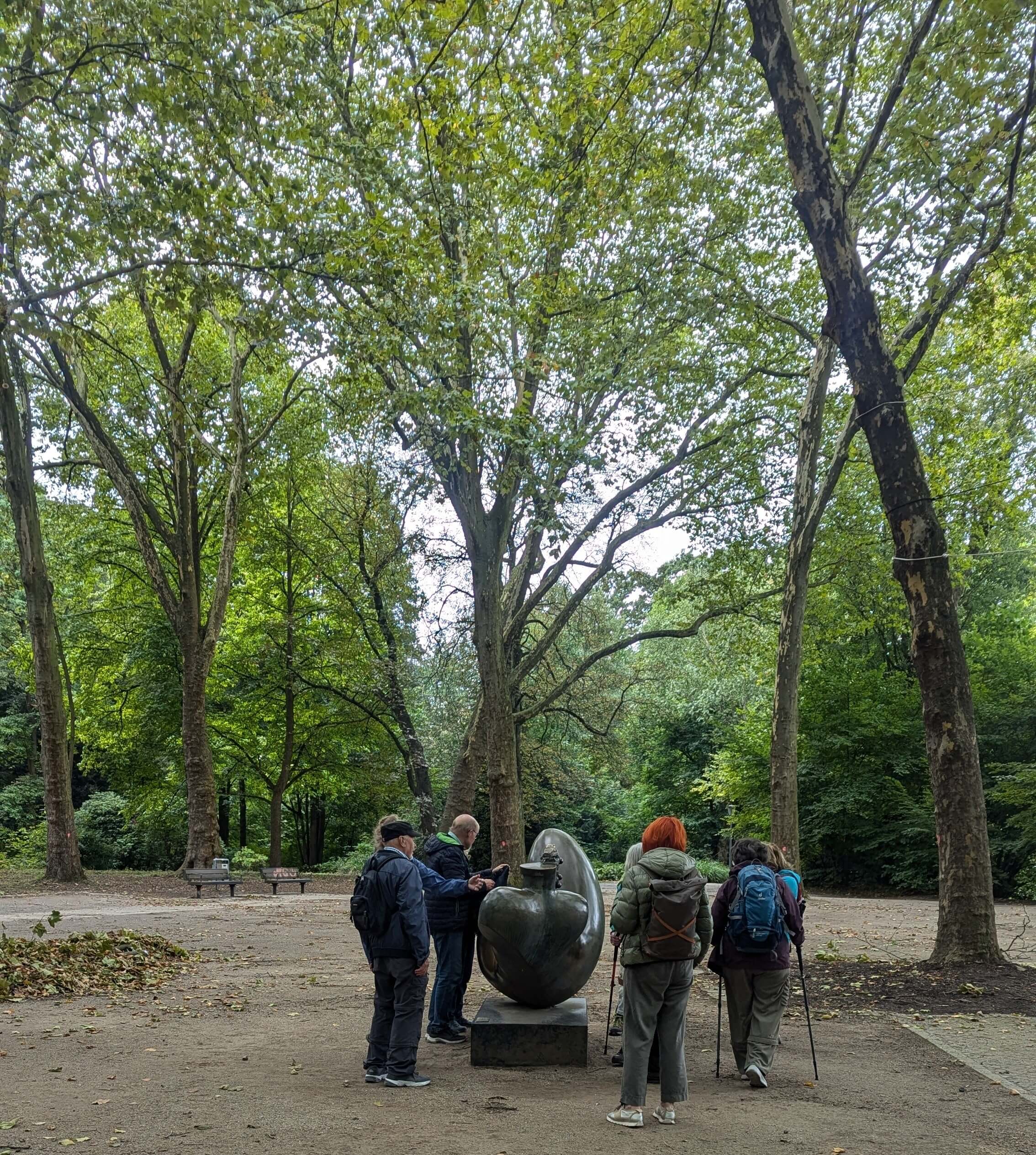An einem Mittwoch im Oktober starten wir bei feuchtem Wetter mit bedecktem Himmel unsere Pkw-Anfahrt wie immer mit Fahrgemeinschaft ab Aplerbeck. Nach 30 min sind wir schon angekommen beim Naturschutzgebiet Tippelsberg und Berger Mühle. Von unserer Wanderführerin Anne erfahren wir, dass der Tippelsberg gar keine Halde ist, sondern eine ehemalige Boden- und Bauschuttdeponie, die sich zu unserer Überraschung zu einer grünen Oase mit grandiosem Fernblick auf viele bekannte Landmarken des Ruhrgebiets entwickelt hat. Beim Aufstieg zum Tippelsberg begleiten uns riesige Fußabdrücke. Wie wir oben auf dem Gipfel erfahren, stammen sie vom Riesen Tippulus. Er leerte bei einer Rast seine Holzschuhe. Der Sand und Steine polterten zu Boden und bildeten einen hohen Berg – den heutigen Tippelsberg. Auf naturbelassenen Wegen, gesäumt von uralten Eichen wandern wir fast die komplette Rundwanderung durch ein wunderschönes Naturschutzgebiet, das größte im Bochum. Mit kurzen Trinkpausen an Bächen und kleinen Seen vergeht die Zeit viel zu schnell.