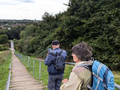 Vom Ausgangspunkt, dem Yachthafen Marina Rünthe, ging es zuerst in Richtung Dattel-Hamm-Kanal mit Blick auf das Kraftwerk Bergkamen und seinem imposanten Schornstein. Aber wer geglaubt hatte, dass uns nur "plattes " Land erwartet, sah sich getäuscht. Der Berg rief uns und das war die Halde "Großes Holz" mit ihren immerhin fast 150 Meter Höhe. Auf schmalen Pfaden und an Skulpturen vorbei, die uns an Fördertürme erinnerten, erklommen wir den "Gipfel" und wurden dafür mit einer tollen Sicht auf das Umland bis zu den Hängen des Ardey-Gebirges und dem Schloss Cappenberg belohnt. Viele kamen aus dem Staunen nicht mehr heraus. Und dies alles hier im "Ruhrpott".