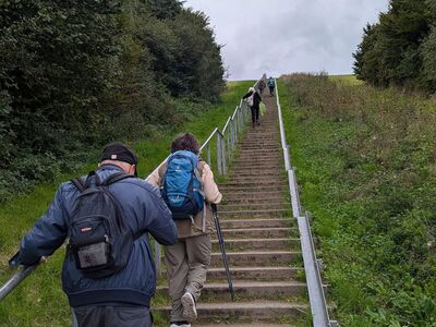 Wir wandern über den steil ansteigenden Zuweg hoch zum Eggeweg und steigen auch auf "Biermanns Nagel". Die Frühstücks-Kalorien sind damit schon mal verbrannt. Der Turm aus dem Jahre 1849 bietet uns die erste schöne Aussicht des Tages. Wir genießen die klare Fernsicht bei bestem Wetter. Herrliche Trampelpfade führen uns zu den Teutonia Klippen, eine ca. 15 m steil abfallende Felswand. Der Eggeweg führt uns heute zuerst an bunten Blumenwiesen und Gräsern vorbei und auch durch kleine Buchenwälder. An einem weithin gut sichtbaren sehr hohen Fernmelde- und Fernsehturm passieren wir einen "Skulturenwald". Zur CO2-Bindung und aus vielen weiteren vorteilhaften Gründen lässt man auf einem riesigen Areal die Baumstümpfe stehen, kürzt sie alle auf die gleiche Länge und pflanzt dazwischen im Schutz die neuen Bäume. Auch heute wie auf dem gesamten Eggeweg gönnen wir uns in fast jeder sehr gepflegten und vom Eggeverein sehr schön gestalteten Schutzhütte eine Trink- oder Futterpause. Der SGV-Trunk aus dem Kleinen Wandersmann darf natürlich auch nicht fehlen. Kurz vor Bad Driburg steigt der Weg stetig an, hoch zur Ruine Iburg, zum Karlsturm und zum Panoramarestaurant Sachsenschänke. Nach ca. 28 km mit ca. 300 Höhenmeter entspannen wir bei einem erfrischenden Getränk auf der Terrasse des Restaurants. Dann laufen wir weiter zum Hotel und lassen den Abend nach einem sehr leckeren Abendessen gemütlich ausklingen.