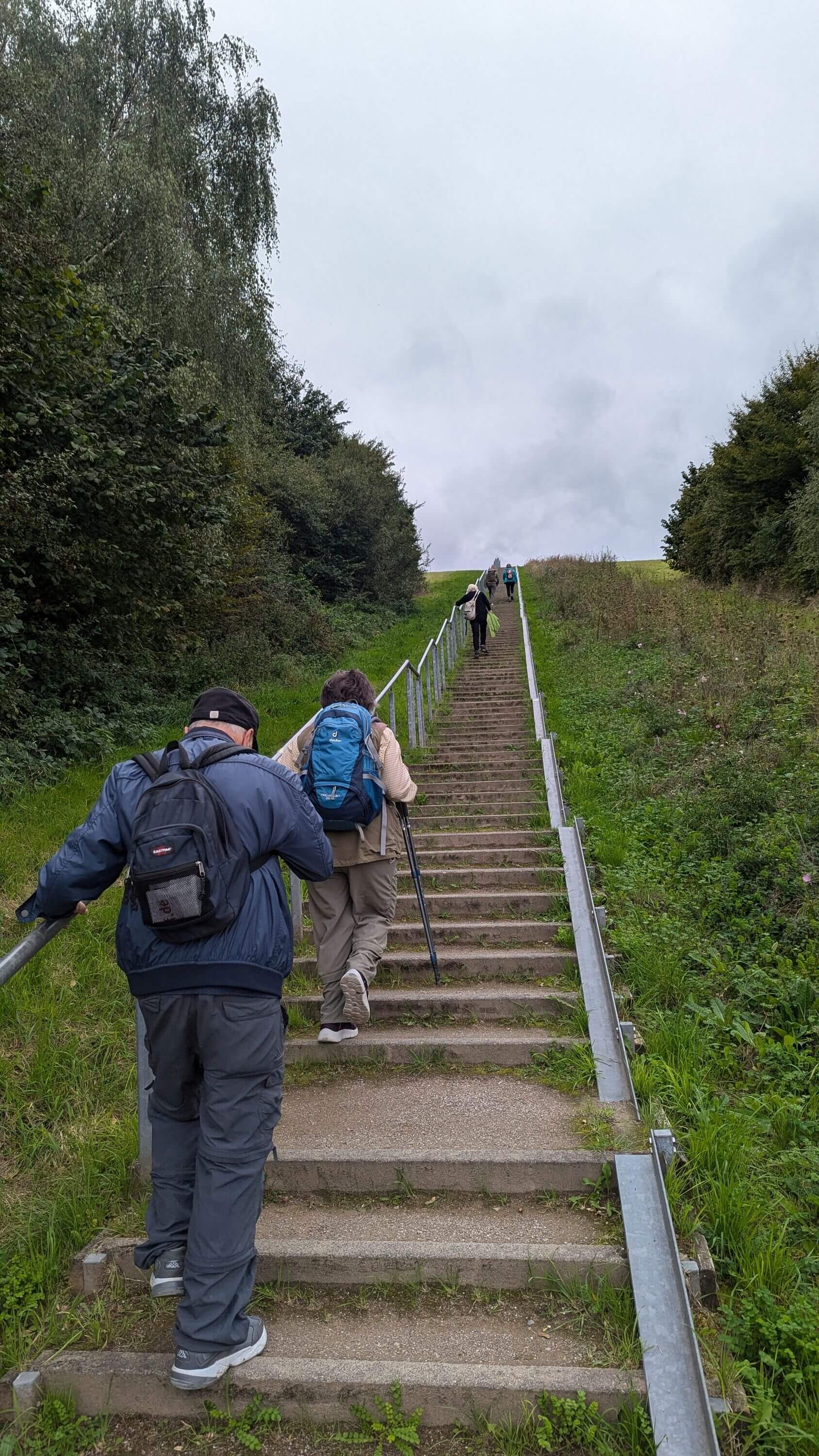 Am einem Sonntag im Juli 2025 haben wir uns mit herrlichem Sommerwetter bei 24 Grad ab dem Wanderparkplatz Piepenprink in Hagen auf den Weg gemacht. Wie immer sind wir per Pkw-Fahrgemeinschaft von Aplerbeck aus gestartet. Unsere Wanderleitung hat eine Wanderung mit 20 km und 500 Höhenmeter für uns vorbereitet. Für den einen ein Hügel, für den anderen ein Berg. Die Sommersonne hat uns an den Anhöhen gut zum Schwitzen gebracht. Doch auf den Höhen haben wir zur Belohnung herrliche Fernsichten und sommergrüne Wälder genießen können. Nach leckerem Pausenbrot beim Picknick im Wald haben wir die letzten zwei Anhöhen gemeistert. Ein kurzer Halt am Hohenlimberger Schloss (weitgehend erhalten, aus dem 13. Jahrhundert) und dann ging es steil hinab zum wohl verdienten Cappuccino oder Kaltgetränk und danach noch ein kurzes Stück wieder hoch über die Boeingstraße und an dem alten Wasserturm vorbei zum Piepenbrink. Die Boeingstraße wurde zu Ehren des Gründers der Firma Boeing, William Boeing, und seinem in Hohenlimburg geborenen Vaters Wilhelm benannt. Danke schön an unsere Wanderleitung. Wir freuen uns schon auf den nächsten Wandersonntag.